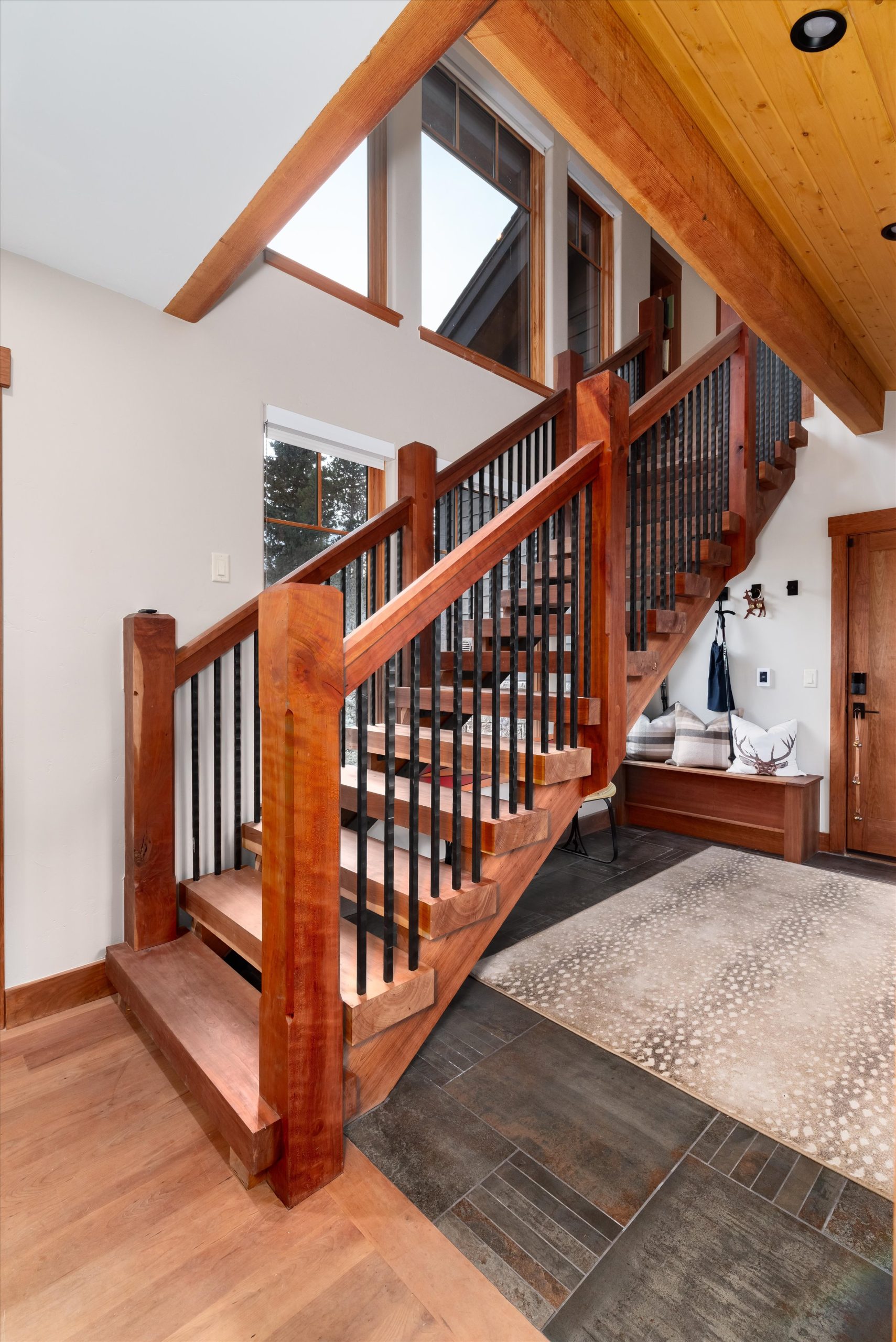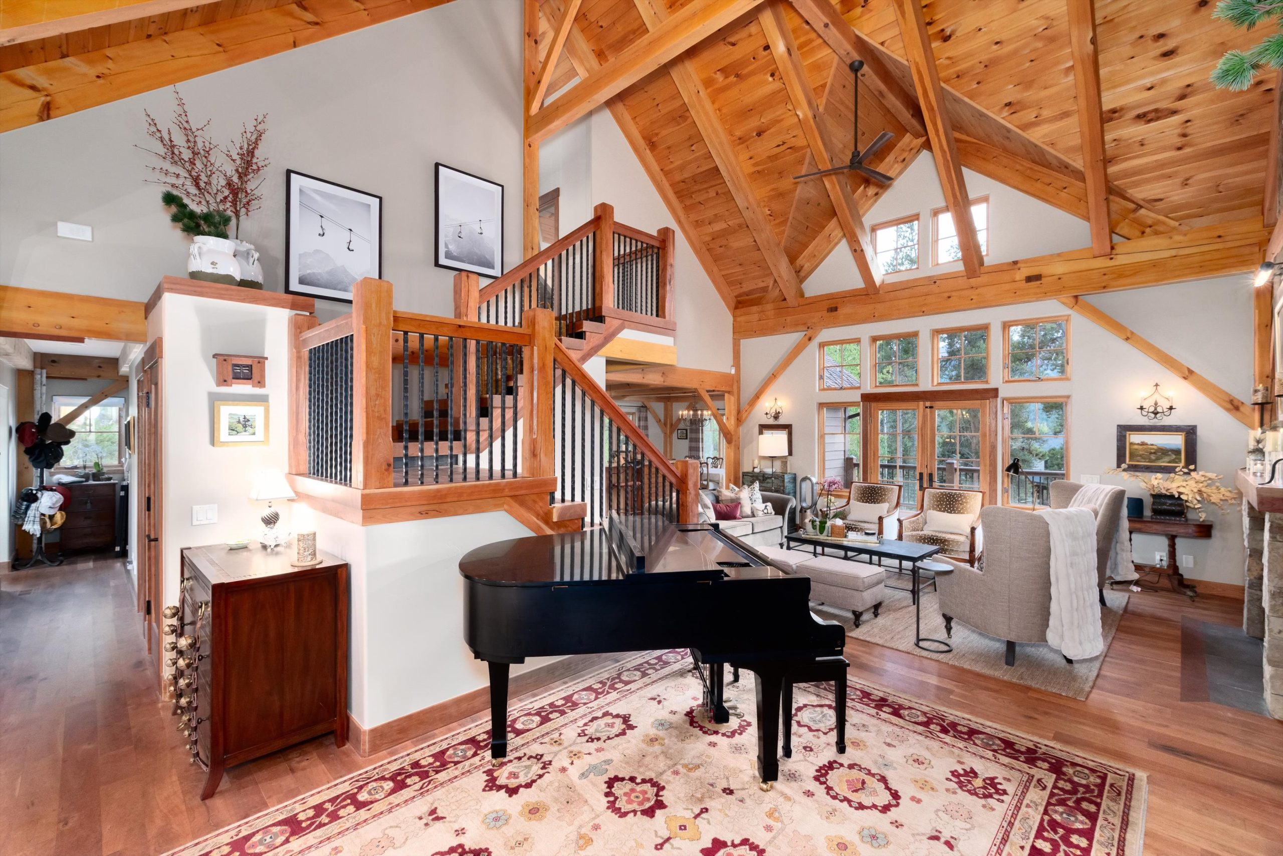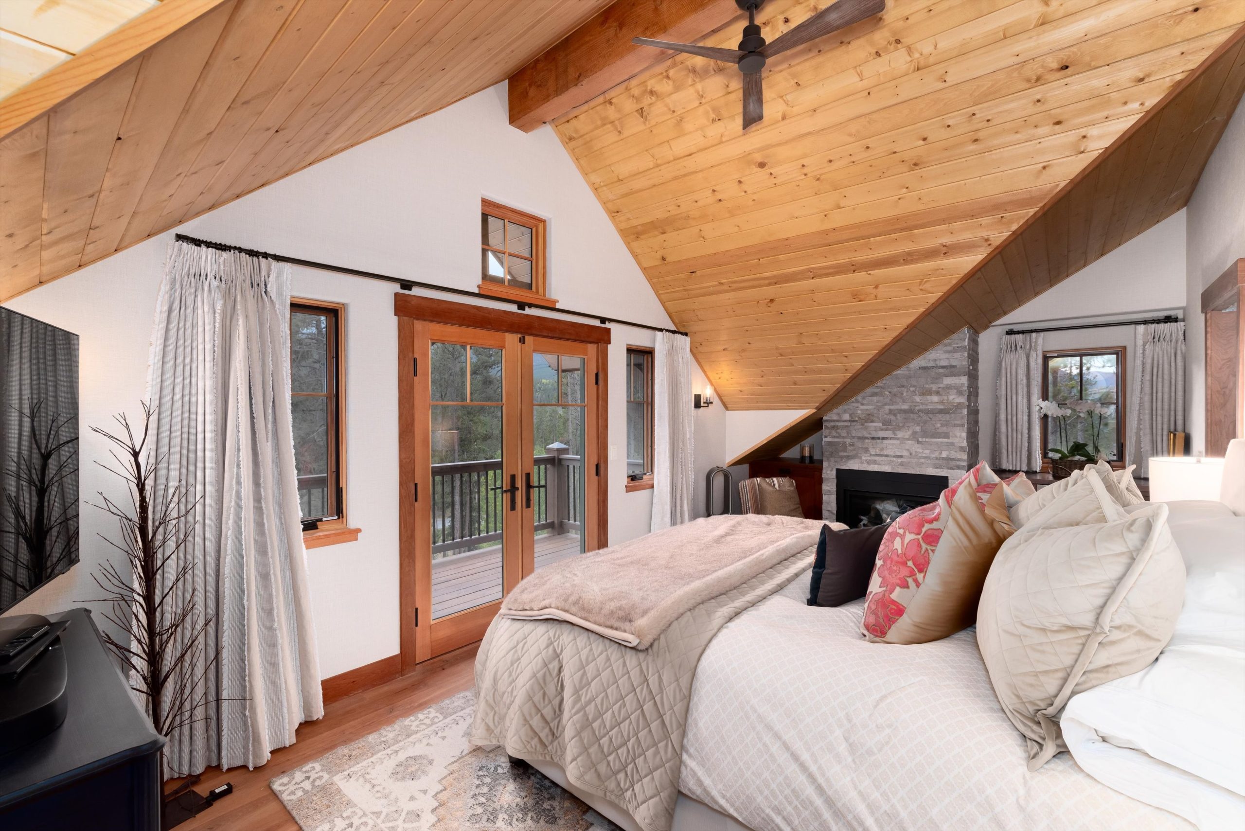 The remarkable home addition is filled with unique surprises, featuring a rare front-loading garage unheard of in this neighborhood, a habitable bridge that gracefully connects the existing structure with the new space, four oxygen bedrooms for your low-altitude guests, a grand see-through fireplace, and two elegant cherry timber stairs accented by cherry hardwood floors and beautiful timber craftsmanship throughout. The home’s design embraces the captivating views while maximizing every available opportunity for the best allowable building height, side-yard setbacks, and driveway access in a code-conscious environment.